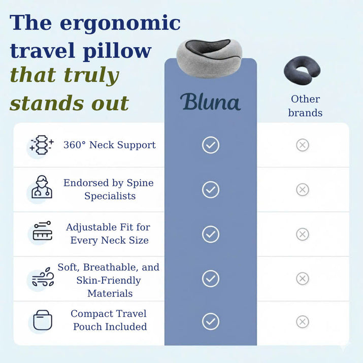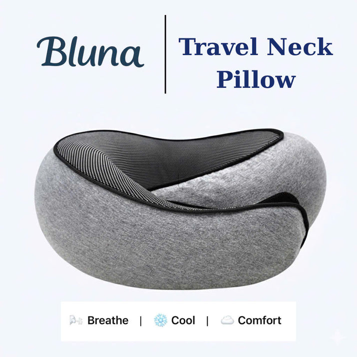 Meet the Bluna Travel Neck Pillow — designed with ergonomic 360° support and breathable cooling fabric to keep you relaxed, supported, and refreshed on every journey.